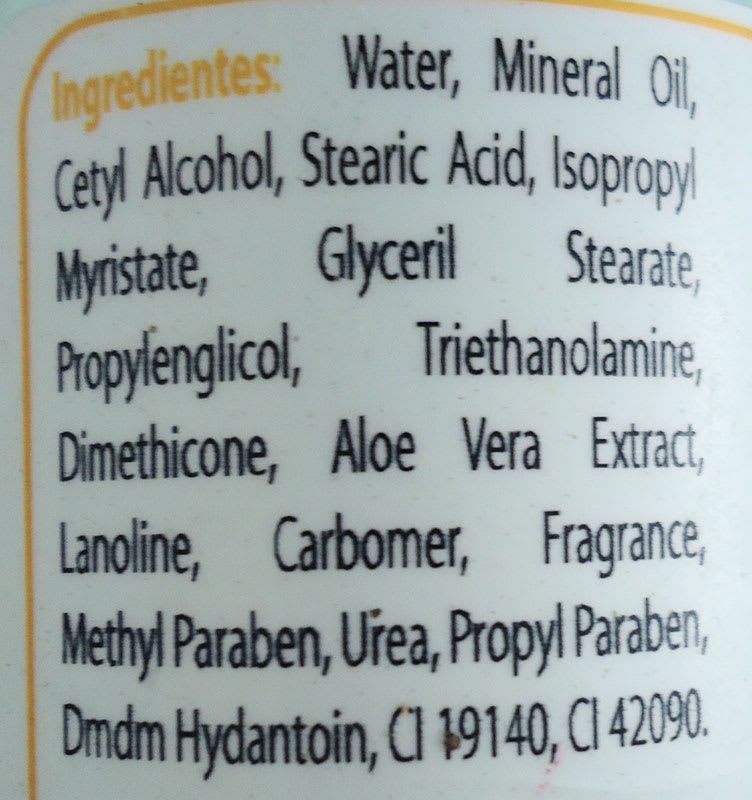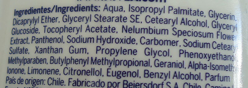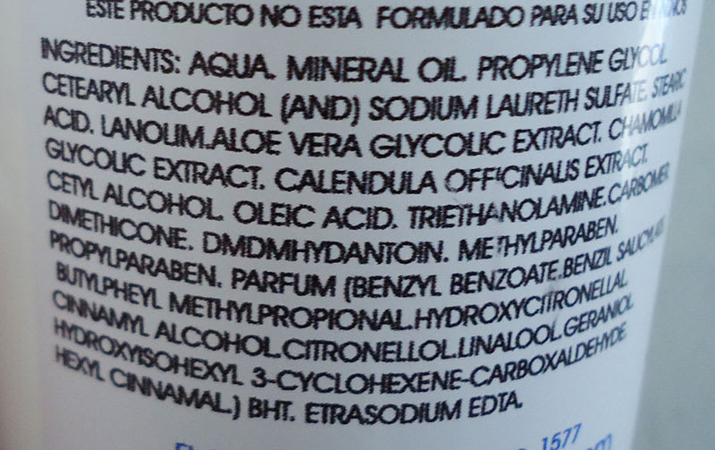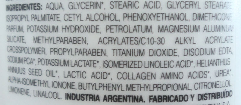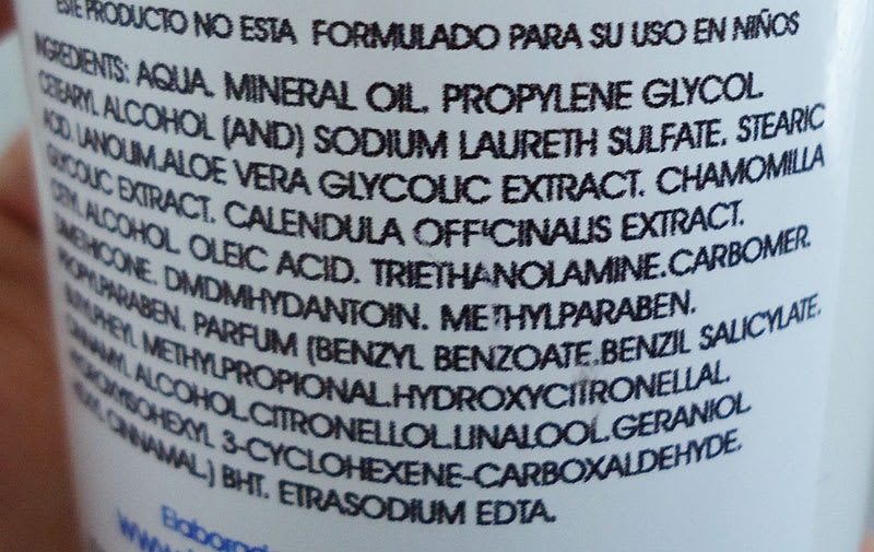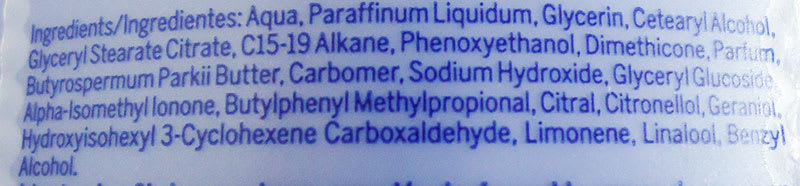 Aqua, Paraffinum Liquidum, Glycerin, PEG-40 Stearate, Dimethicone, Steareth-2, Cetyl Alcohol, Xanthan gum, Decyl Glucoside, Phenoxyethanol, Niacinamide, Methylparaben, Parfum, Propylparaben, BHT, Potassium lactate, Lactic acid, Alpha-Isomethyl Ionone, Benzyl Alcohol, Butylphenyl Methylpropional, Citronellol, Geraniol, Hexyl Cinnamal, Limonene, Linalool.