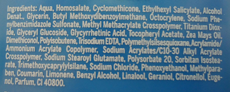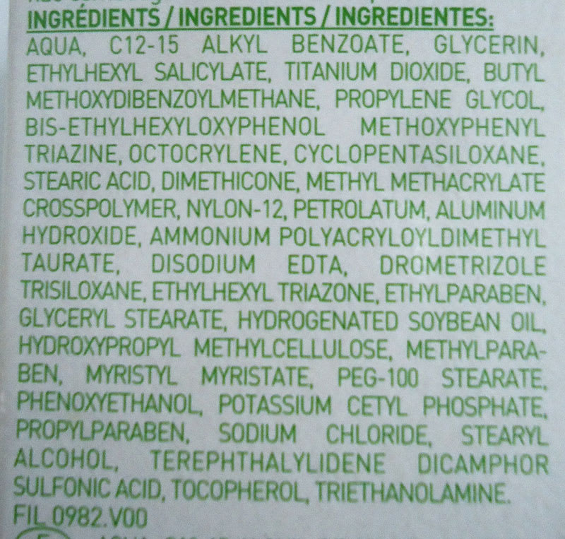 Water, Myristic Acid, Palmitic Acid, Niacinamide, Stearic Acid, Ethylhexyl Methoxycinnamate, Glycerin, Tapioca Starch, Triethanolamine, Cyclopentasiloxane, PEG/PPG-18/18 Dimethicone, Cetyl Alcohol, Butyl Methoxydibenzoylmethane, Phenoxyethanol, Fragrance, Carbomer, Acrylates Crosspolymer, Methylparaben, Propylparaben, Disodium EDTA, Sodium Ascorbyl Phosphate.