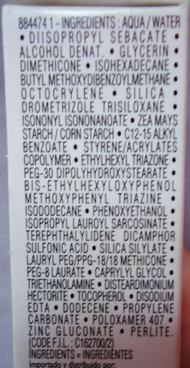 – Titanium Dioxide (no nano): para mi este es el culpable del color fantasmal horrible que deja esta cosa…. para mi esto tendría que estar en nano o en menor concentración del 5% que reporta este producto.